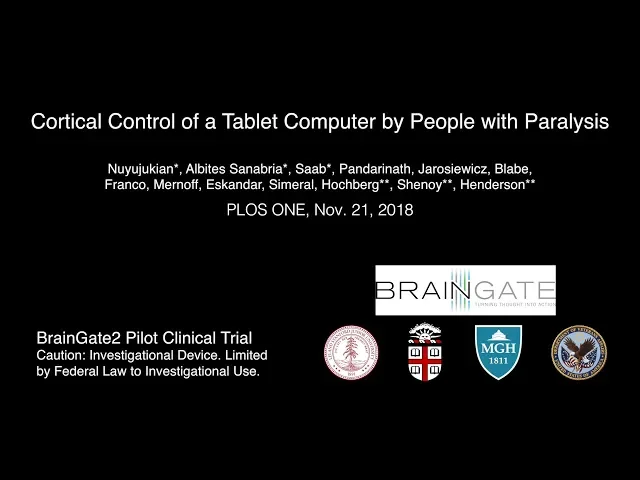 BrainGate is an investigational brain-computer interface that restores communication and mobility to people with paralysis from spinal cord injury, or stroke. A tiny silicon chip with 100 electrodes implanted in the motor cortex captures neural signals which algorithms translate into commands for computers, tablets, and robotic limbs.